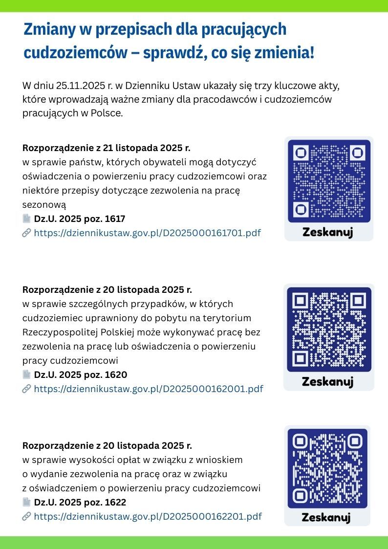 Powiatowy Urząd Pracy w Rawie Mazowieckiej informuje, że w dniu 25 listopada 2025 r. w Dzienniku Ustaw opublikowano akty prawne wprowadzające istotne zmiany w zasadach powierzania pracy cudzoziemcom, obowiązujące od 1 grudnia 2025 r.