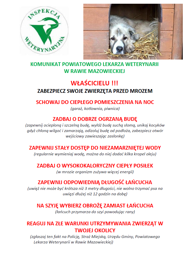Komunikat Powiatowego Lekarza Weterynarii w Rawie Mazowieckiej dotyczący warunków utrzymywania zwierząt w okresie zimowym